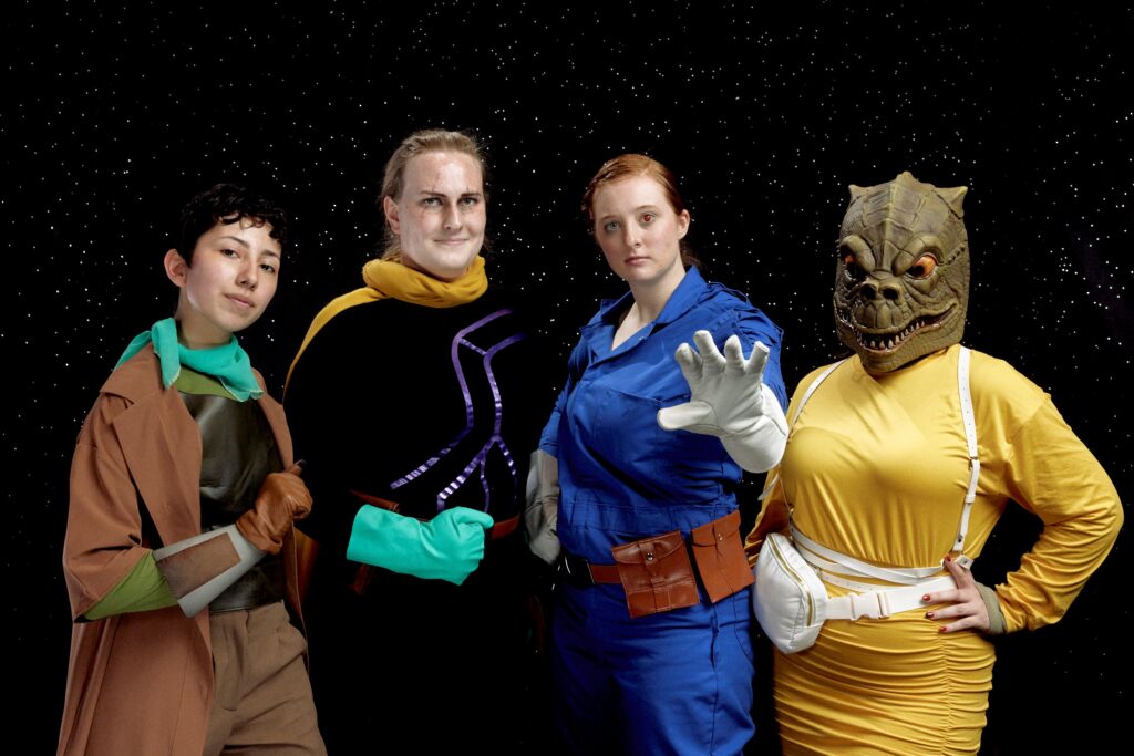 Our Bounty Hunters group cosplay at Star Wars Celebration London 2023, from left to right: Isabella as T’onga, Lia as Vukorah, Hayden as Valance, and myself as GirlBossk (this is my legacy)